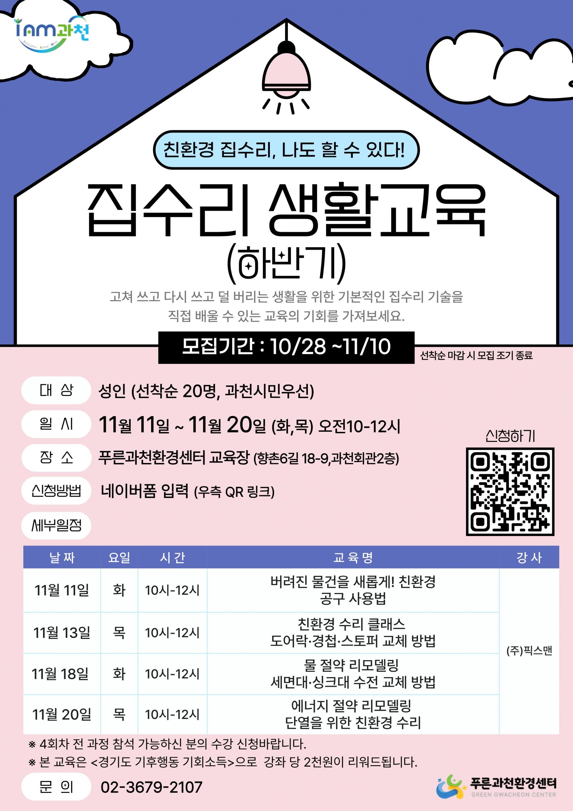 과천시민을 위한 실생활 밀착형 교육 프로그램상반기 큰 호응 속에 마감된 인기 프로그램이 돌아왔습니다!고쳐 쓰고, 다시 쓰며, 버리는 생활을 줄이는 친환경 집수리 기술,직접 배우고 실습할 수 있는 절호의 기회!